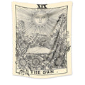 The Tarot Card Wall Tapestry beautifully depicts The Sun card, a symbol of joy, clarity, and life’s vibrant energy. A luminous sun with a gentle, smiling face radiates warmth, while a naked child riding a white horse represents innocence, purity, and the freedom of the spirit. Sunflowers line the scene, symbolizing the four elements and the suits of the Minor Arcana, grounding the card’s imagery in both nature and tarot tradition.